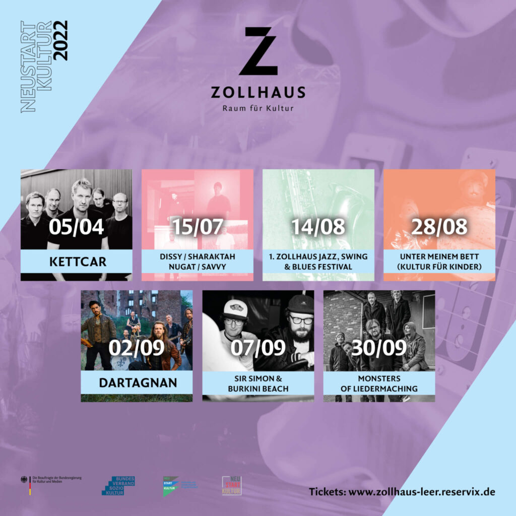 NEUSTART KULTUR 2022 Fördermaßnahme der Initiative Musik und des BKM (Beauftragte der Bundesregierung für Kultur und Medien) über 6 Neustart Kultur 2022 Konzerte im Zollhaus. Bisher stehen folgende Daten fest: Di., 09.08.2022 – Audio88 & Yassin Fr., 26.08.2022 – Die Sterne [foogallery id=“1575″]