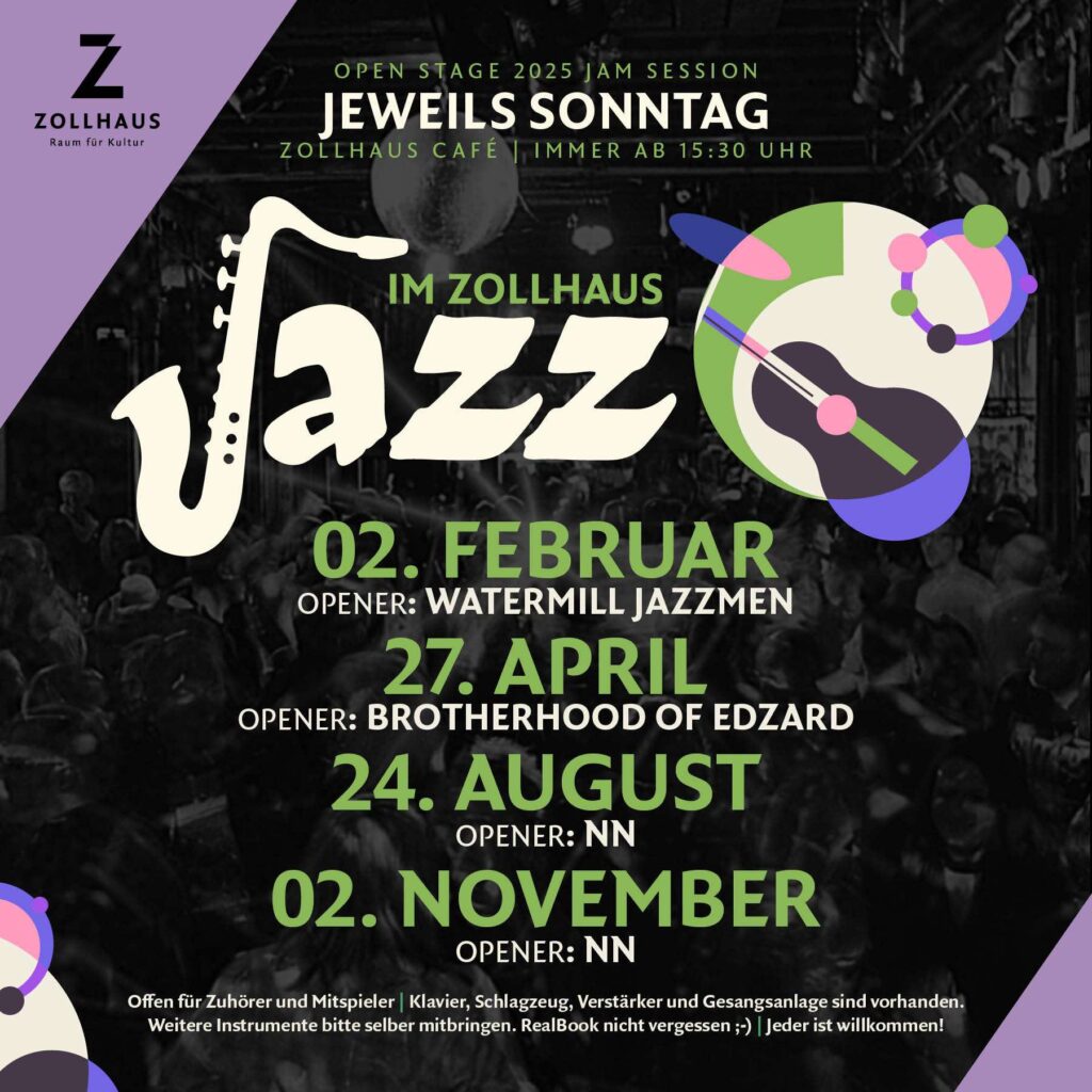Auch in diesem Jahr freuen wir uns auf weitere 4 Termine unserer Open Stage/Jam Session im Rahmen unserer Reihe „Jazz im Zollhaus“ – immer sonntags ab 15:30 Uhr im Zollhaus Café.