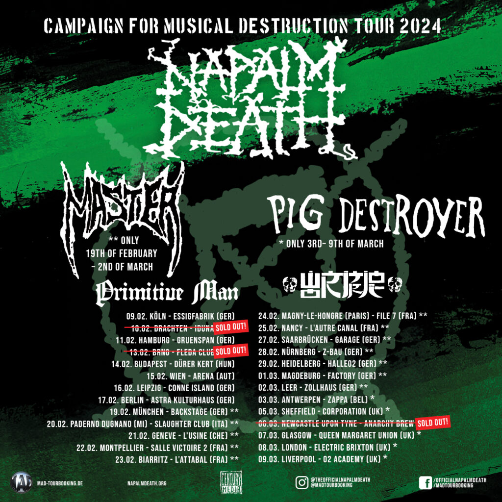 Nachdem Biermächt leider ohne Begründung ihren Flug verpassten und gestern zum Auftakt der CAMPAIGN FOR MUSICAL DESTRUCTION TOUR mit Napalm Death, Primitive Man und Wormrot in Köln nicht mit dabei waren, mussten wir kurzfristig umdisponieren und konnten mit der legendären Band MASTER nun für mehr als würdigen Ersatz sorgen.