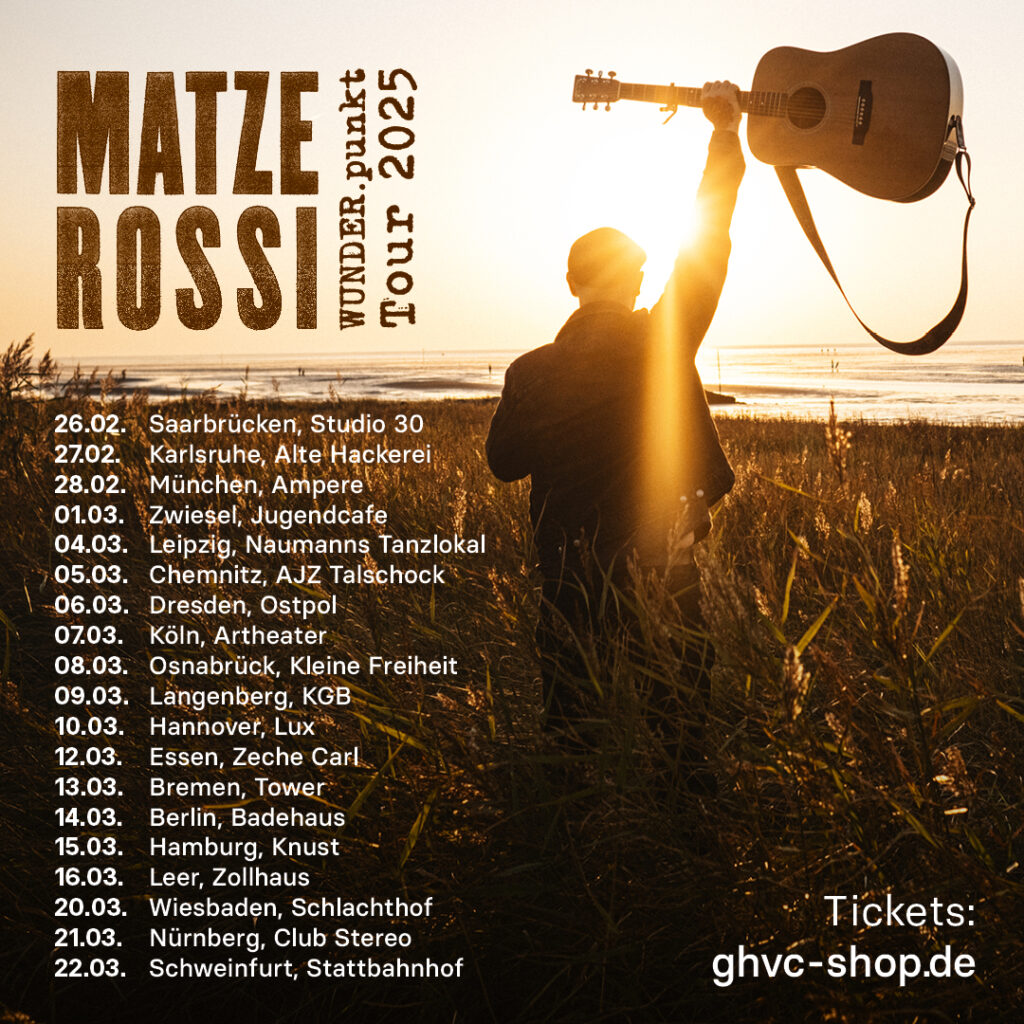 Tickets bei Reservix https://zollhaus-leer.reservix.de/tickets-matze-rossi-wunderpunkt-tour-2025-in-leer-zollhaus-am-16-3-2025/e2325802 oder im https://www.ghvc-shop.de/