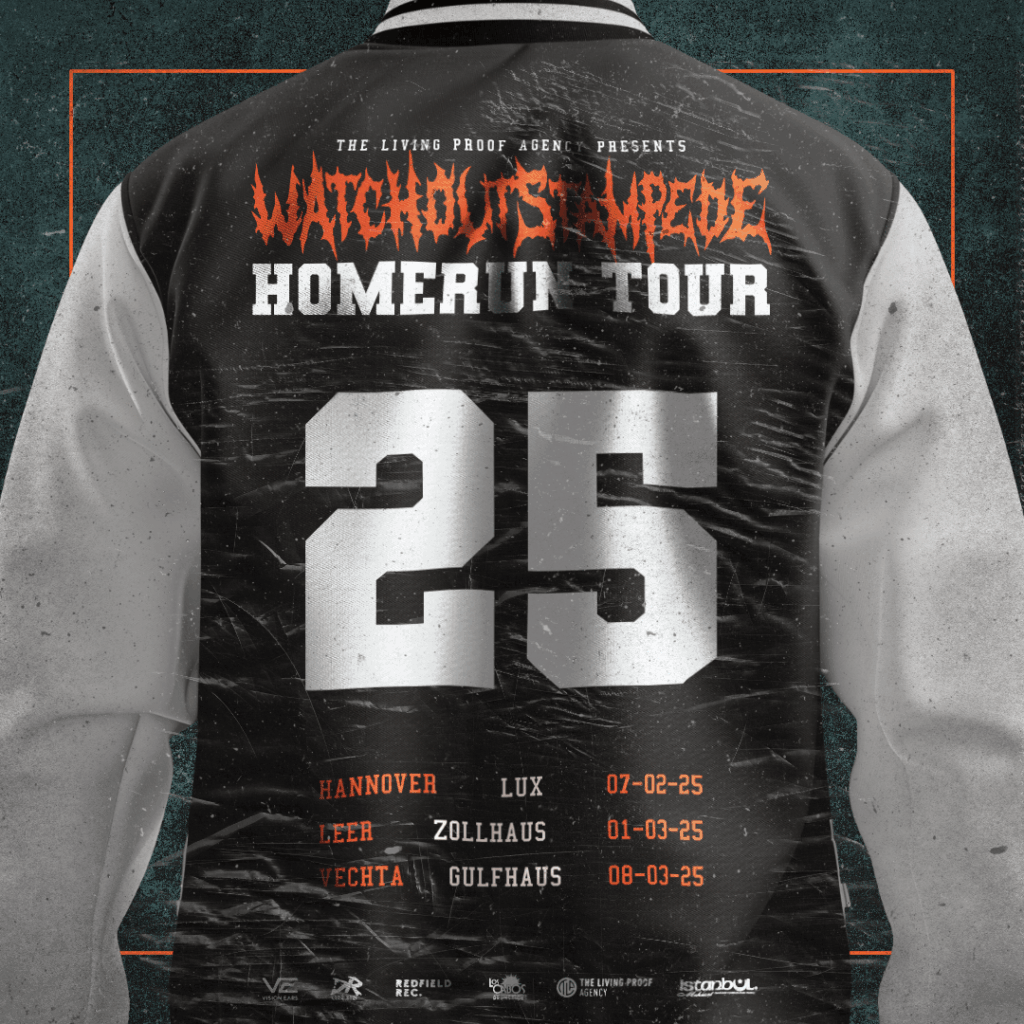 Rundumschlag im Norden! WATCH OUT STAMPEDE gehen im kalten Küstenwinter auf Tour und knöpfen sich dafür die heißesten Venues der norddeutschen Tiefebene vor. Ausgehend von ihrer Heimat Bremen schwingen sie die Metalcore-Keule in alle Himmelsrichtungen – bis kein Stein mehr auf dem anderen geblieben ist! Ist auch kein Wunder, denn auch sonst brennen WATCH OUT STAMPEDE lichterloh: Letztes Jahr hat das Quartett ein ordentliches Tempo vorgelegt und alle zwei Monate eine nagelneue Single gepitcht. Nun ist es an der Zeit, das Material auf die Welt loszulassen! Das heißt, große Refrains, wütender Core und verschwitzte Mittdreißiger zum Anfassen. Wer will da noch mehr? WATCH OUT STAMPEDE kommen in eure Stadt – und ihr kommt in euren Lieblingsclub. Das wird ein HOMERUN!